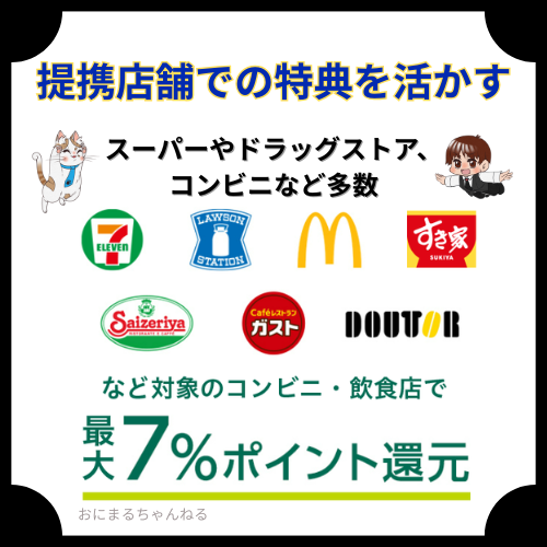 Vポイントは三井住友カードの特約店で使うことで、通常よりも高い還元率を得ることができます。特約店で利用するとポイント還元率がアップするため、特定の店舗でのお買い物には特に有効です。